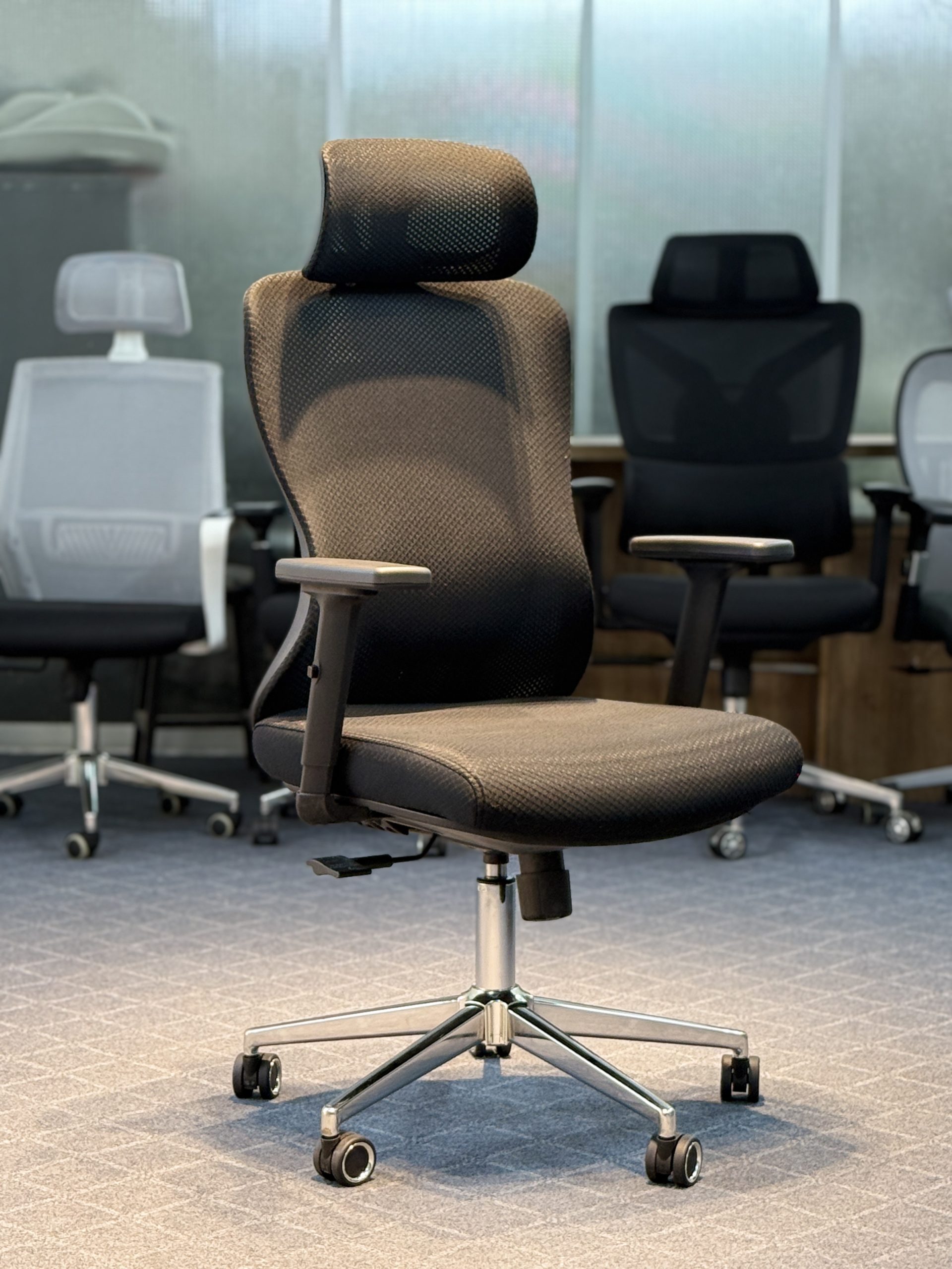 Experience next-level comfort with the AURA Vortex Ergo Chair, engineered to deliver unmatched support and flexibility for long working hours. This premium, fully imported office chair features a strong mesh back for airflow, a rotating adjustable headrest, and multi-position armrests for the perfect ergonomic setup. With its advanced 5-gear tilt mechanism, users can lock the backrest at any angle for personalized comfort.
